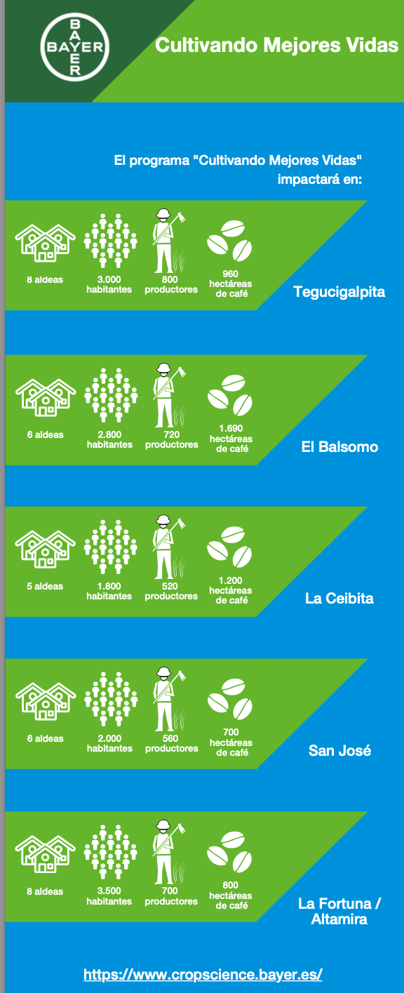 Para ofrecer una nueva oportunidad a estos caficultores y hacer que su actividad sea rentable, gracias al acceso a los insumos y la tecnología necesarias y a la asistencia técnica, Bayer lanza en Honduras el programa “Cultivando Mejores Vidas”, el cual consiste en la construcción de quioscos que funcionan como proveeduría de insumos y tecnología y desde donde se prestarán servicios de asistencia técnica a las familias productoras, para que desarrollen su actividad de forma sostenible y pasen de la producción de mera subsistencia, a otra que les genere más rentabilidad sobre sus tierras y su producción.