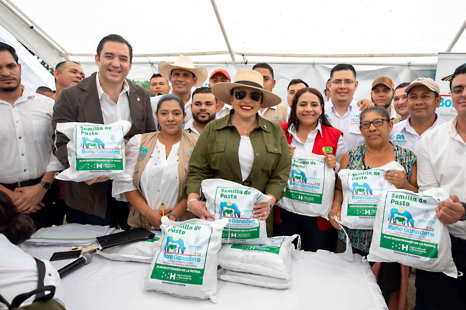 La presidenta Xiomara Castro, junto a la titular de la Secretaría de Agricultura y Ganadería (SAG), Laura Suazo, lanzaron en el municipio de Catacamas, Olancho, el programa Bono Ganadero, que, con una inversión de 50 millones de lempiras, beneficiará a al menos 16 mil pequeños productores de Honduras, a quienes se les entregará semilla de pasto y cercas eléctricas.