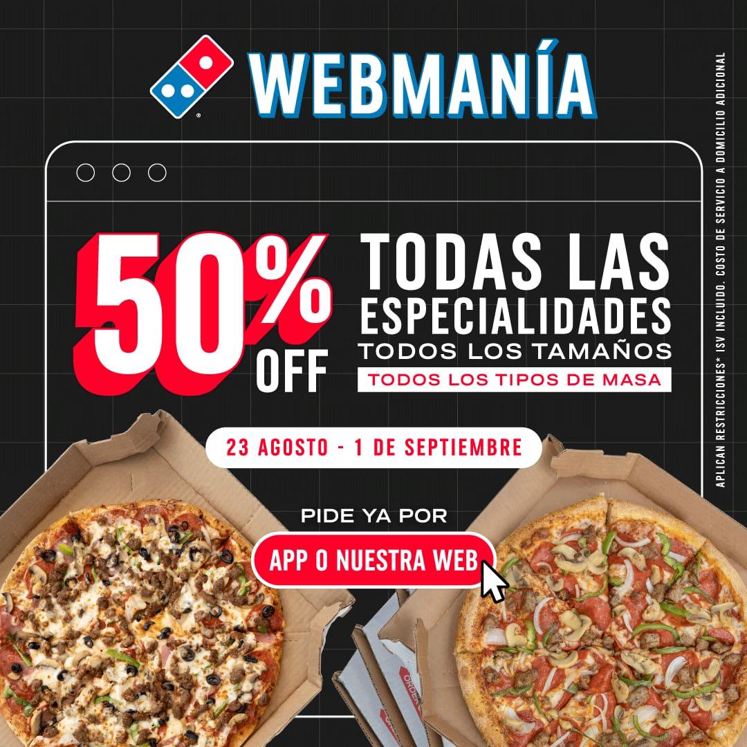 ¡Atención a todos los amantes de la pizza! Domino's presenta su emocionante promoción: “Web Manía”, una oferta irresistible que te da un 50% de descuento en todas las pizzas de especialidad, disponible exclusivamente en nuestra página web y aplicación móvil, a partir del viernes 23 de agosto al domingo 1 de septiembre. Esta es la oportunidad de disfrutar de tus pizzas favoritas a mitad de precio, ¡y con solo un clic!