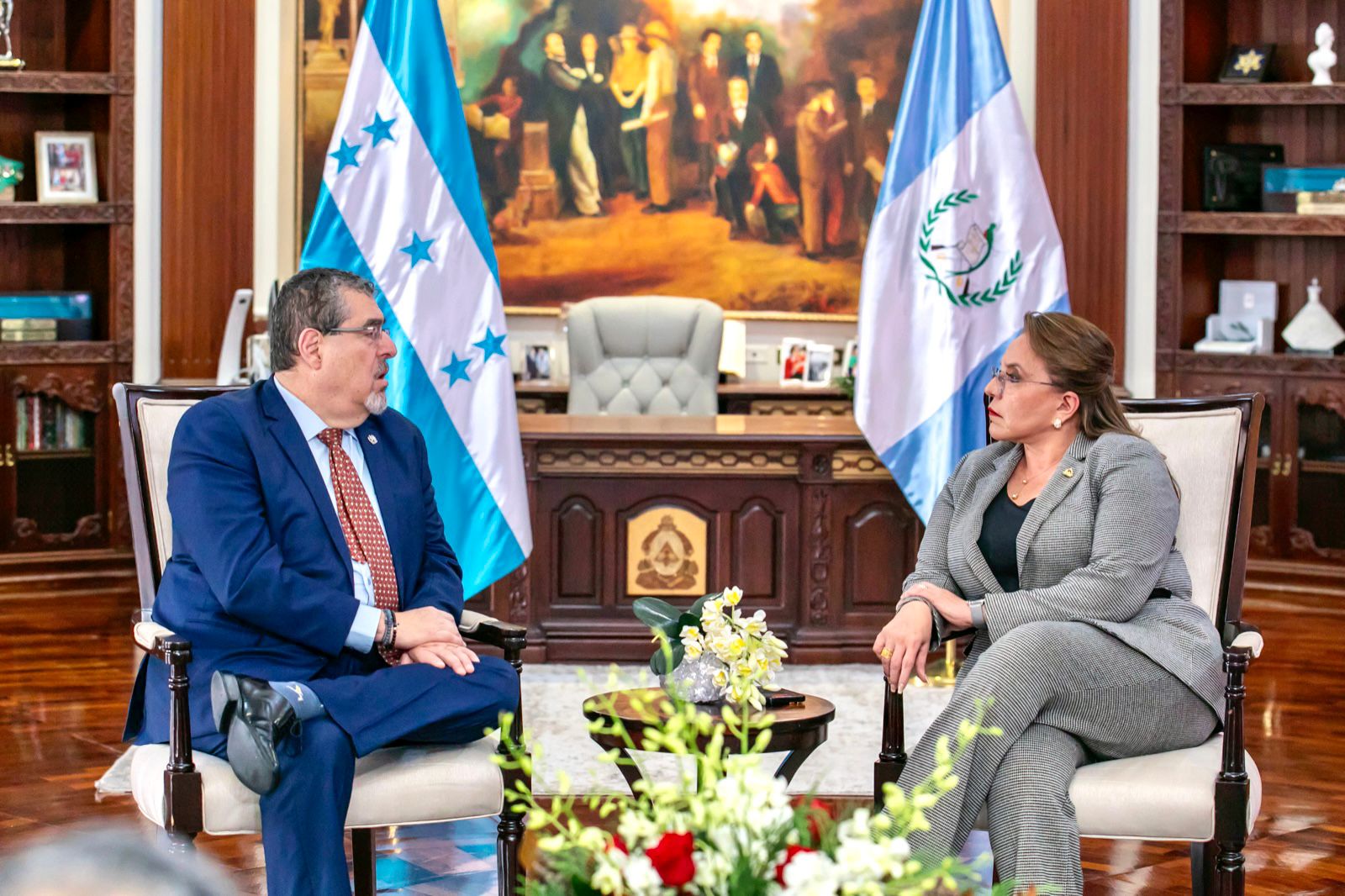 La mandataria Xiomara Castro recibió hoy al presidente electo de Guatemala, Bernardo Arévalo de León, quien realizó su última visita de cortesía a jefes de gobierno a diez días de asumir el mando en el hermano país.