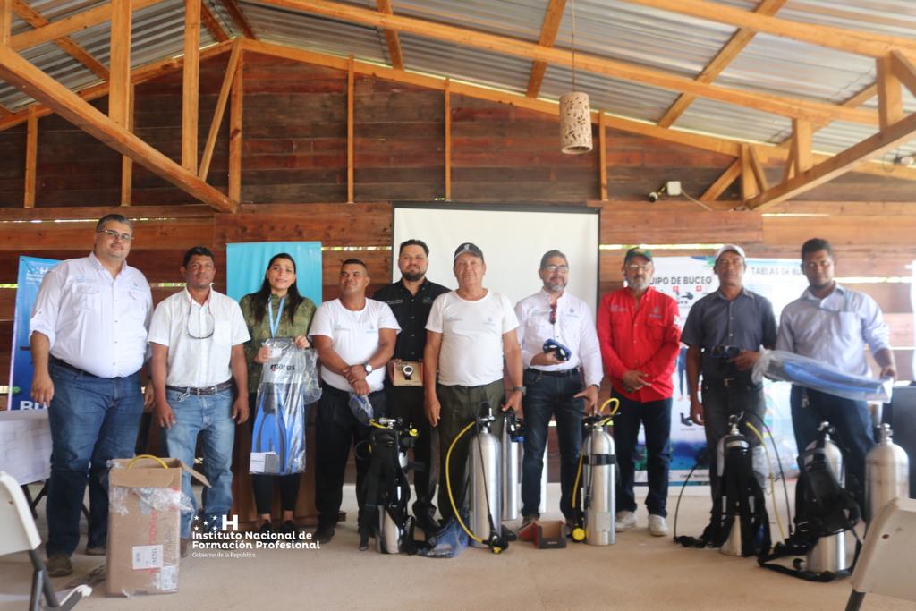 Con el objetivo de fortalecer la formación técnica profesional a través del Curso de Buceo Seguro, El Director Ejecutivo del INFOP, Carlos Suazo, entrega 10 equipos completos como máscaras, tanques, aletas, monturas, Profundimetros, manómetros y optopus, los cuales serán utilizados por instructores en la formación y certificación en la zona de la Mosquitia