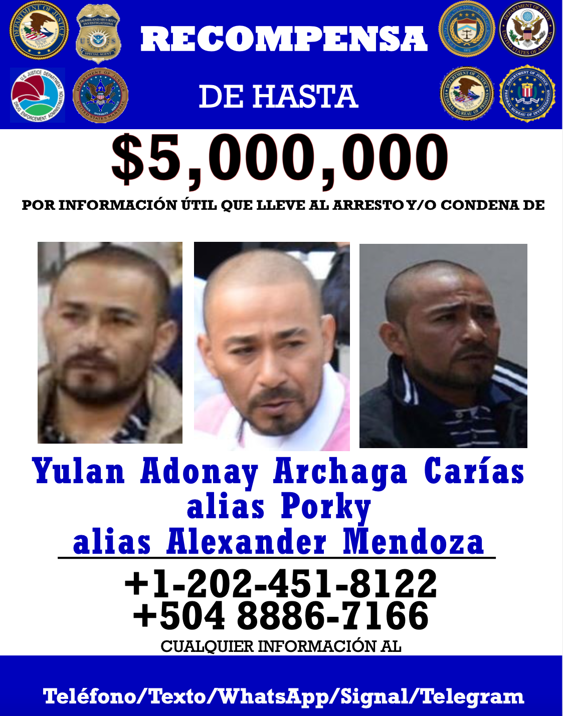En el día de hoy, anunciamos el ofrecimiento de una recompensa de hasta USD 5 millones a cambio de información que posibilite la detención y/o condena de Yulan Adonay Archaga Carías, también conocido como “Porky” o Alex Mendoza, por conspirar para participar o intentar participar en criminalidad organizada transnacional. Este anuncio complementa una imputación penal del Departamento de Justicia de Estados Unidos, por la cual se acusó a Archaga Carías en 2021 de conspiración para violar las leyes sobre extorsión de Estados Unidos, conspiración para importar cocaína a Estados Unidos y posesión de una ametralladora en relación con un delito de narcotráfico.