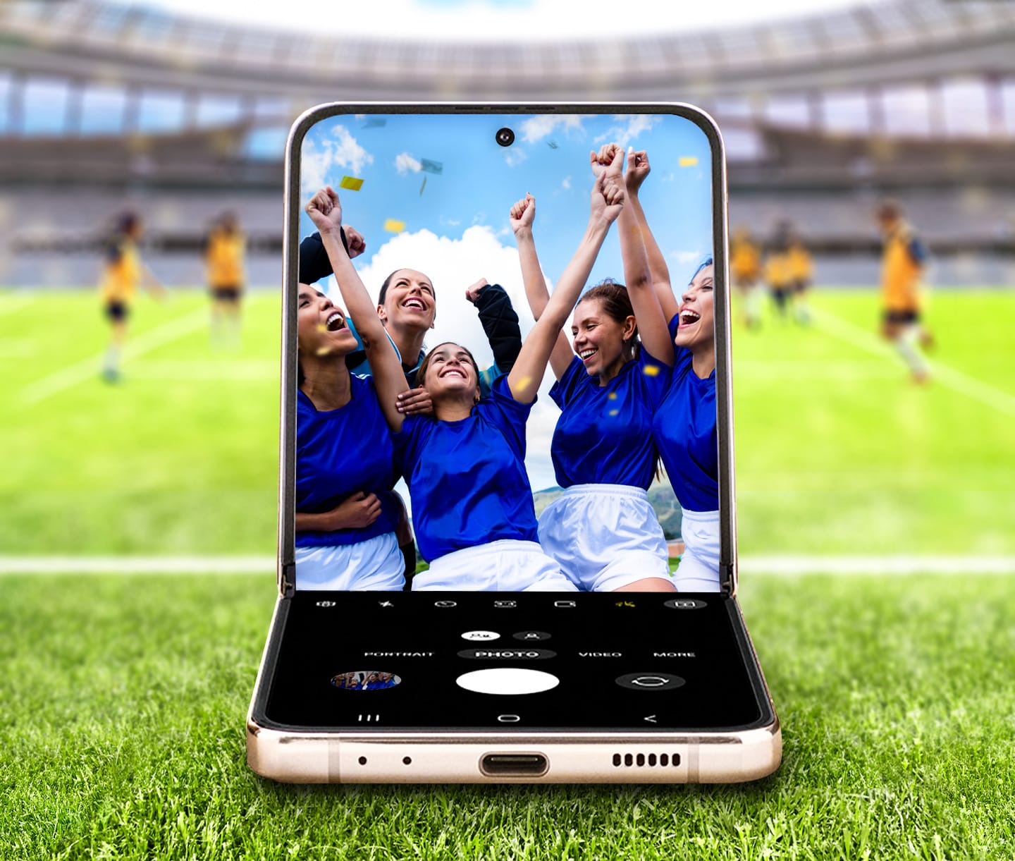 Captura y comparte todos los momentos destacados del día del partido con detalles vívidos con tu Galaxy Z Flip4. Con FlexCam1, puedes disfrutar de la captura con manos libres doblando tu dispositivo para que sirva como un trípode. ¿Un momento inesperado surge durante el juego? Toma una selfie de alta resolución sin siquiera abrir tu dispositivo con Quick Shot para capturar cada reacción, recuerdo y expresión en alta calidad.