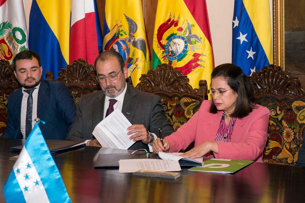 La Sala Capitular del Palacio de Bolívar en Ciudad de Panamá, donde se llevó a cabo en 1826 el Congreso Anfictiónico de Panamá, convocado por el Libertador Simón Bolívar, y que sería la primer espacio de la integración latinoamericana con la finalidad de crear una confederación de países latinoamericanos para fortalecer la independencia de las nuevas naciones y la defensa mutua; fue el escenario en el que la ministra de Finanzas de Honduras, Rixi Moncada; el ministro de Hacienda de Costa Rica, Nogui Acosta; y el representante del Ministerio de Hacienda de Chile, Rodolfo Bustamente; firmaron los convenios de suscripción de acciones de capital ordinario de CAF.