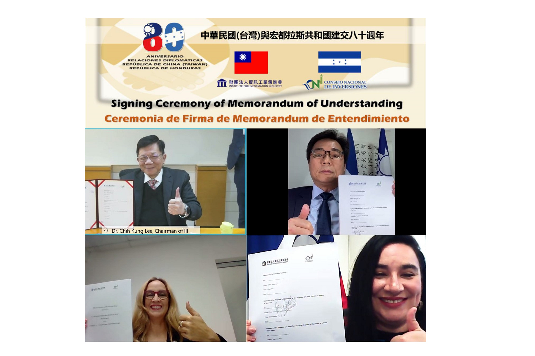 El Instituto para la información de la Industria (III) y el Consejo Nacional de Inversiones de Honduras firman el Memorádum de Entendimiento, en este 2021, en el marco del 80 Aniversario de Relaciones Diplomáticas entre Taiwán y Honduras. Por esa razón, es de gran significado la firma de este Memorádum de Entendimiento para la transformación digital entre las dos naciones, esperamos atraer industrias de los dos países a una cercanía en próximos diálogos de cooperación.
