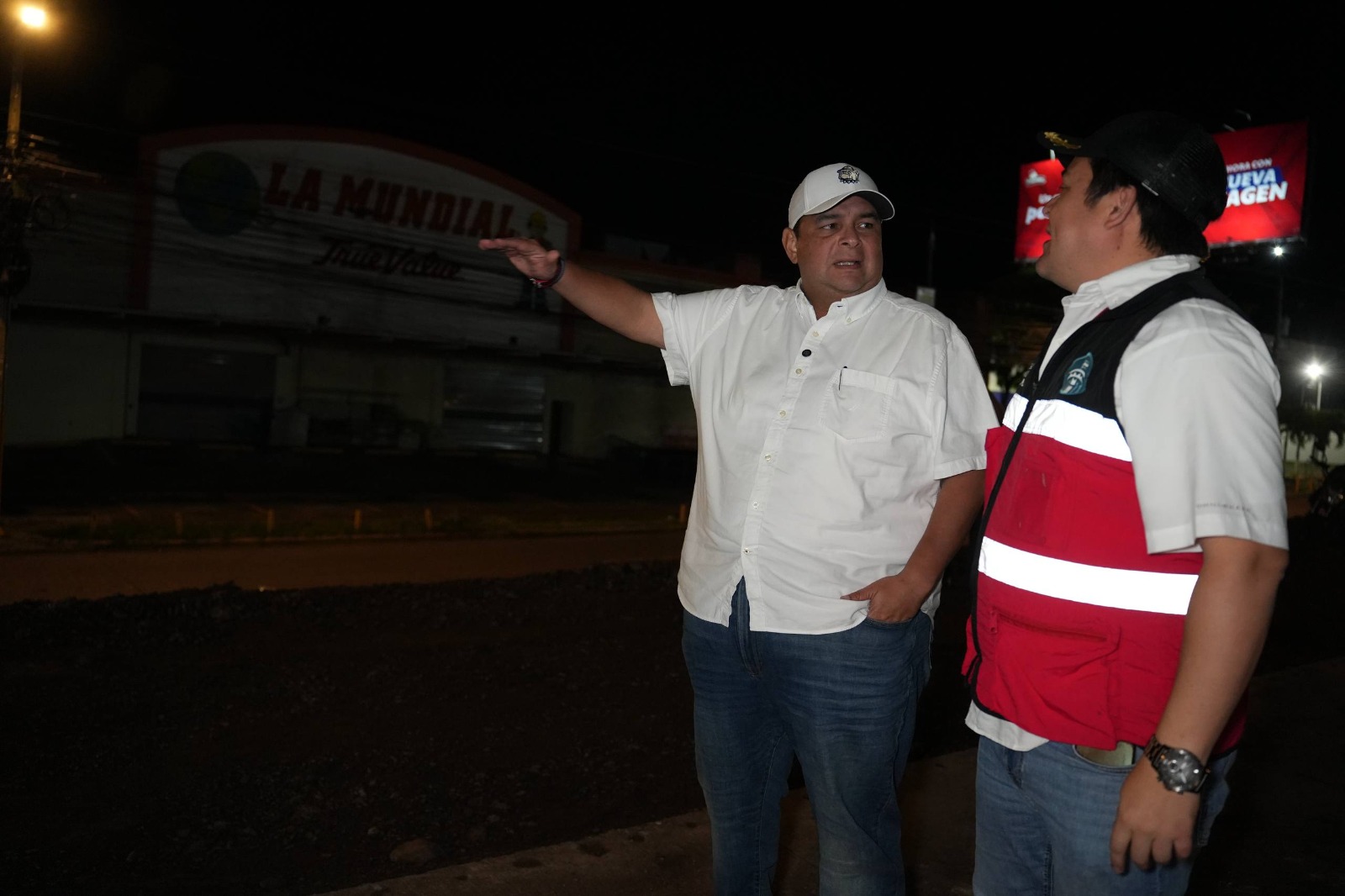 El alcalde Jorge Aldana acudió anoche a supervisar los trabajos de fundición de losas para esta obra de infraestructura vial.