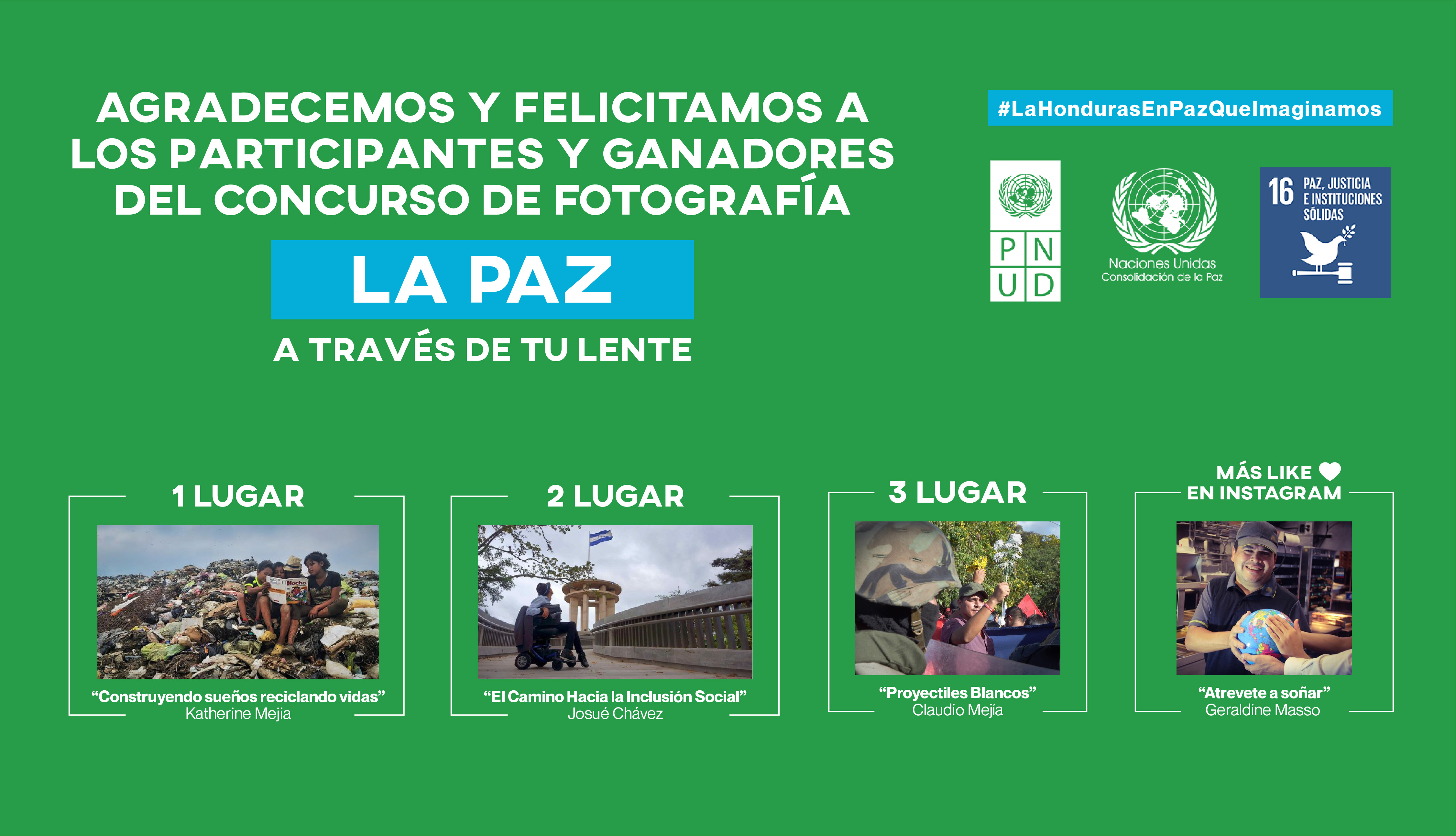 También, la foto titulada “Atrévete a soñar” de Geraldine Vanessa Masso Bueso recibió el premio, de la fotografía con más "likes" en la cuenta de Instagram del PNUD en Honduras. Se contaron los "likes" recibidos hasta el 20 de enero, quien fue acreedor de un aro de luz profesional, un micrófono y un trípode para smartphone.