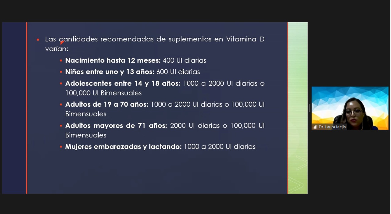 “Las dosis necesarias de Vitamina D para cada persona están directamente relacionadas con su edad y los niveles de la vitamina en el cuerpo, con el objetivo de llegar o mantenerse en los niveles óptimos recomendados (entre 40 y 60 ng/ml). Asimismo, se toman en cuenta estilos de vida y condiciones de salud del paciente”, afirmó la Doctora Laura Mejía, médico especialista en endocrinología.