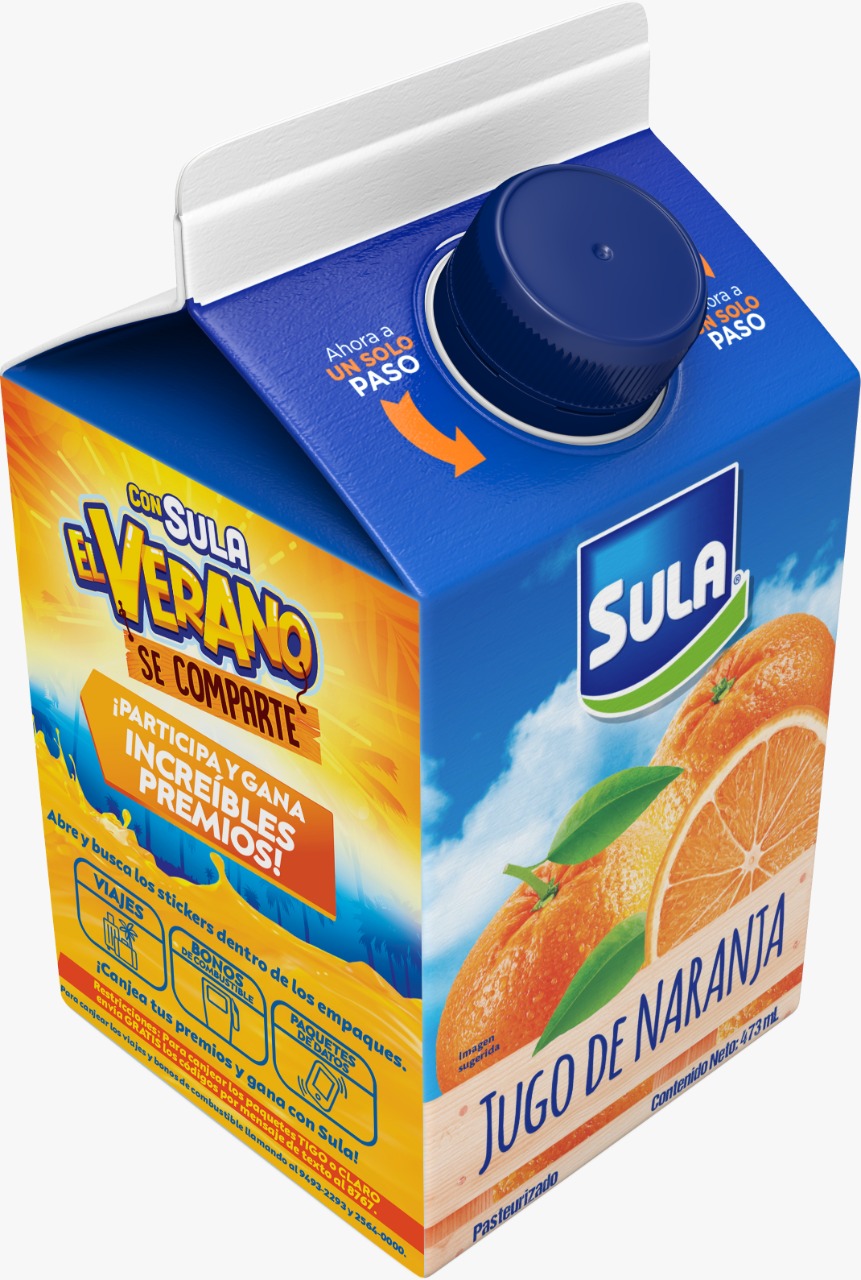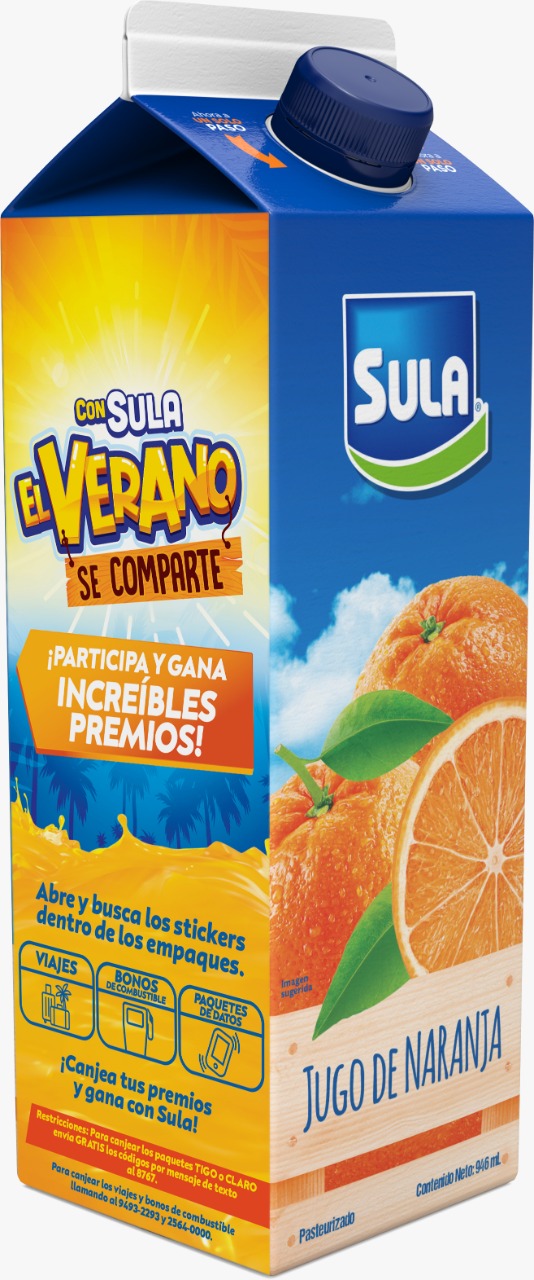 Compra Jugo de Naranja Sula en sus empaques de 473 y 946 ml en pulperías, supermercados o tienda de conveniencia, abre y busca los stickers dentro de los empaques, los stickers indican cuál es el premio: si es viaje, bonos de combustible o paquetes de datos. Para canjear los premios de viaje y/o combustibles llama al 9493 2293 o al 2564 0000; y para canjear los stickers de paquete de datos de Tigo o Claro envía gratis los códigos por mensaje de texto al 8767 y ganarás al instante, canjea tus premios y gana con Sula.