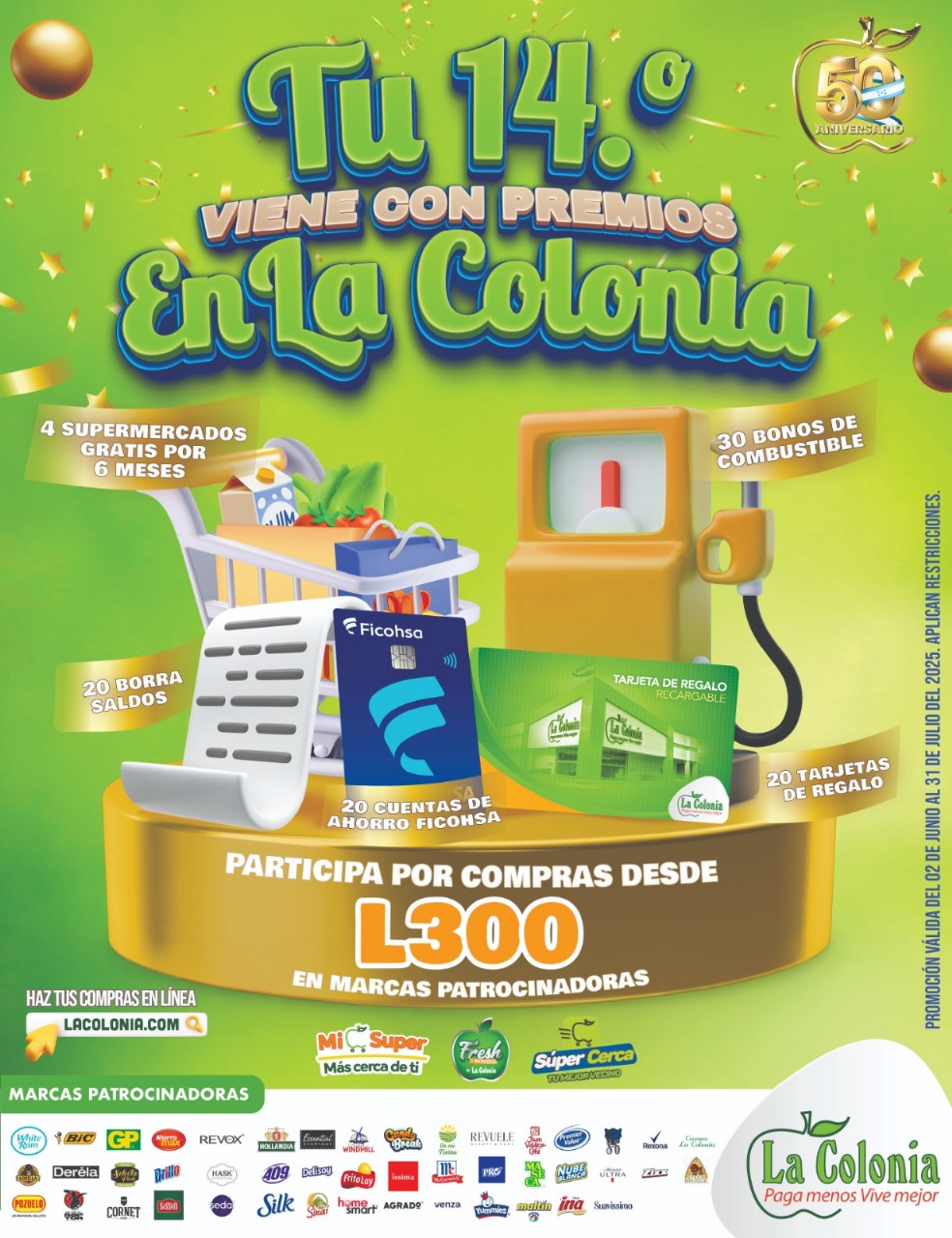 La promoción “Tu 14.º viene con premios en La Colonia” estará vigente del 2 de junio al 31 de julio en nuestras 68 tiendas a nivel nacional, incluyendo los formatos Fresh Market, Mi Super y Súper Cerca, así como en compras en línea a través www.lacolonia.com