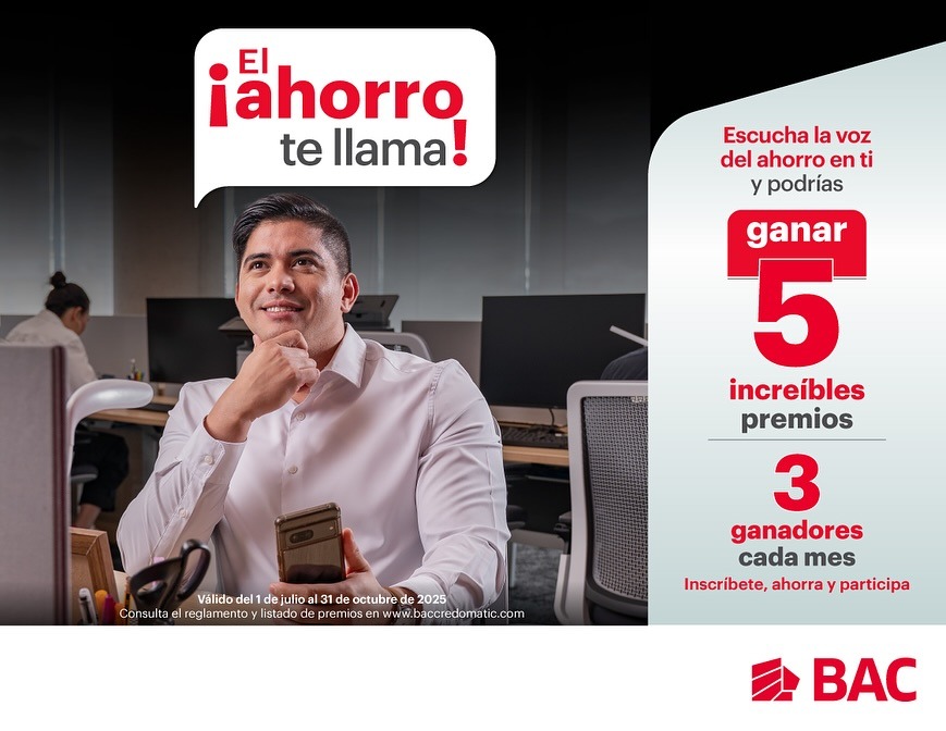 BAC invita a la población en general y a sus clientes a estar atentos de sus publicaciones en redes sociales para conocer las constantes promociones, beneficios y oportunidades que ofrece, a lo largo del año. Puedes ver el reglamento de esta promoción aquí: Reglamento_Promocion_EL_AHORRO_TE_LLAMA_1_JUL_a_31OCT_2025.pdf