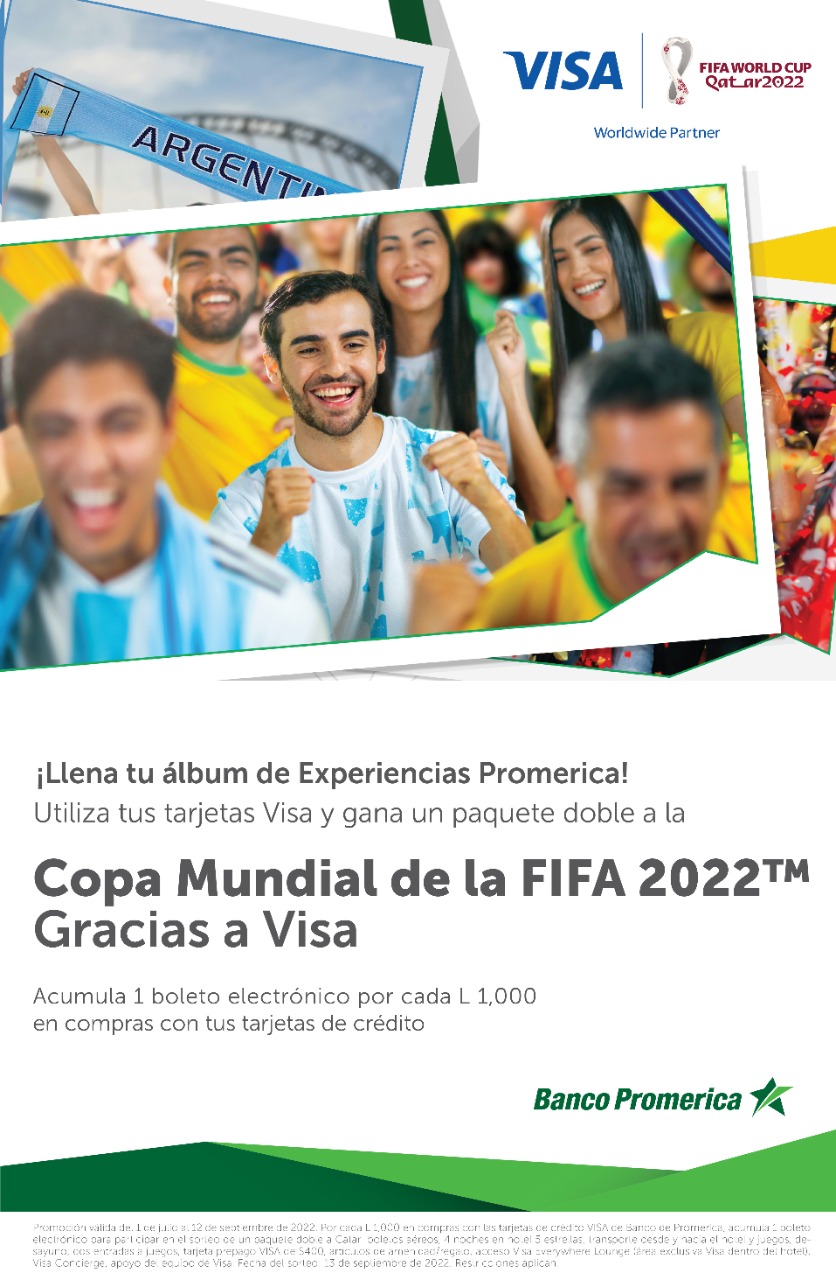 Banco Promerica y Visa, lanzan la promoción “Llena tu álbum de Experiencias Promerica” que llevará a un afortunado ganador a disfrutar junto a un acompañante de la Copa Mundial de la FIFA ...