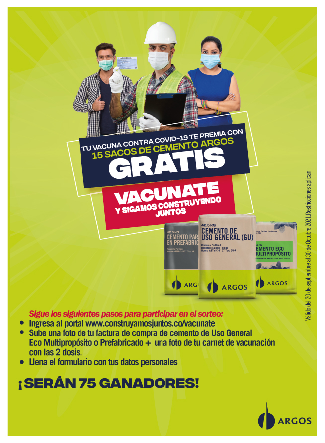 Cementos Argos, empresa líder en producción y comercialización de cemento a nivel nacional, lanza la promoción “Tu vacuna te premia con cemento gratis”, con la finalidad de incentivar a la ...